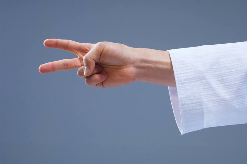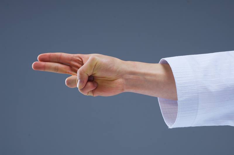 The fingertips of the index finger and the middle finger are stretched and closed together while other three fingers are rolled into the palm.