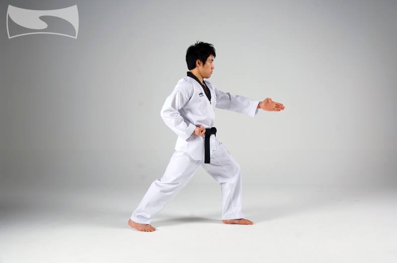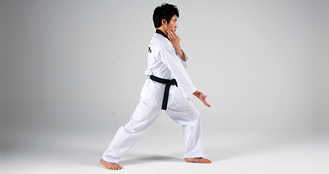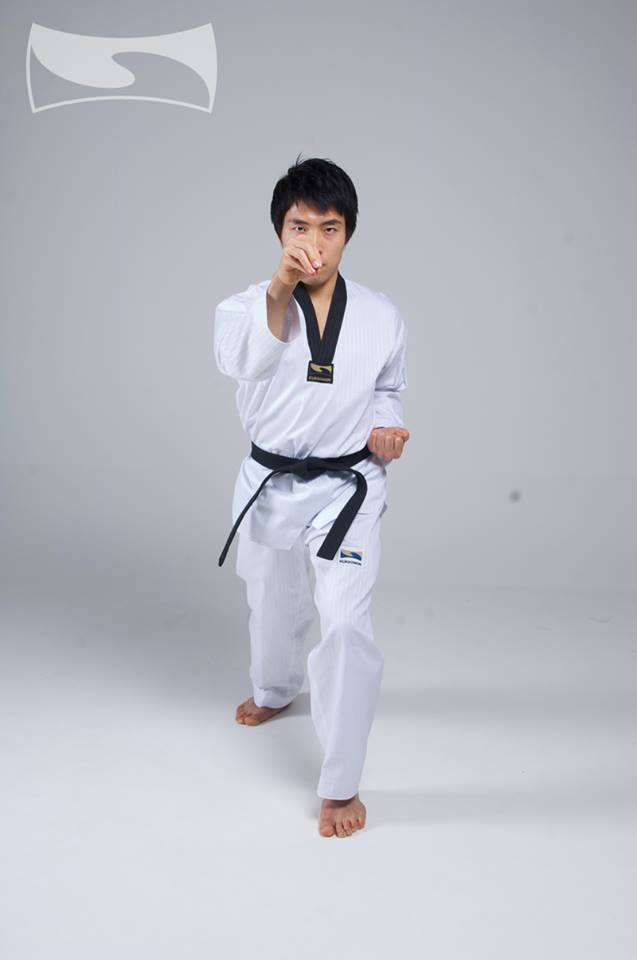 A technique of thrusting at a target with the fingertips vertically turned up. This is a skill to strike the opponent’s solar plexus. By using hansonkkeut (Single Fingertip), moeundusonkkeut (Combined Two Fingertips) and moeunsesonkkeut (Combined Three Fingertips), one can strike the opponent’s eyes or neck. In order to defend and attack consecutively, onehand executes nulleo-makgi (Pressing Block) while the other hand performs geodeureo-sewo-jjireugi (Supporting Vertical Thrust) in succession.