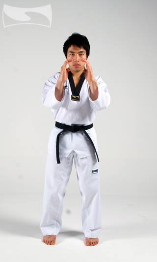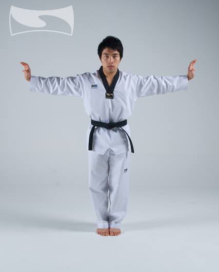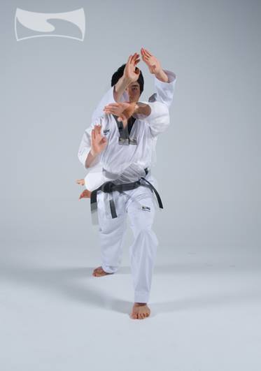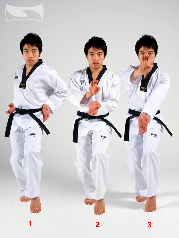 A motion of pushing an imaginary mountain. This is a movement of pushing a big mountain in order to focus the performer’s mind and control his or her breathing. This movement can be delivered by putting the heels of both palms close to each other in the form of the Palm Heel. The fingertips on the side of the front foot should point down while those on the side of the rear foot point up. These open hands are to be pushed away at the front of the chest.